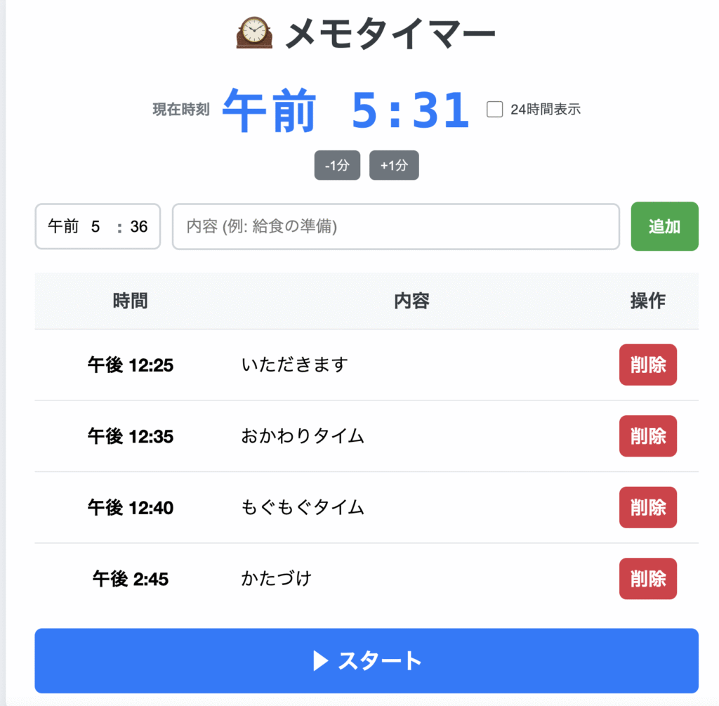 メモタイマー 自立活動 2025.09.042026.01.18 使ってみる👉メモタイマー 時間になったら、音でメモをお知らせします。見通しを持って安心して活動できるように作りました。 時間と内容を入力して、「スタート」を押すだけ。 使ってみる👉メモタイマー