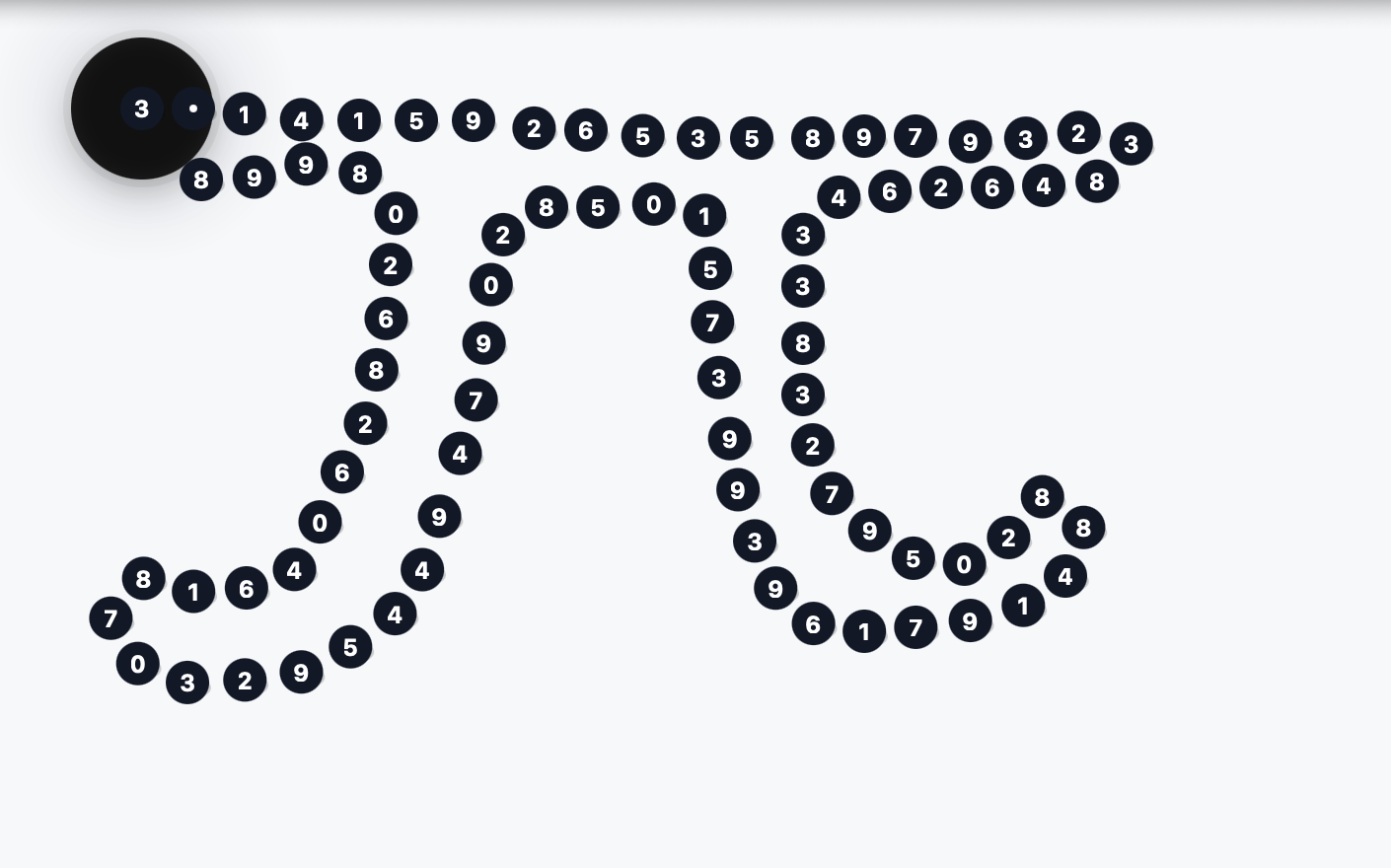 【算数】円周率の巣 算数 2025.10.01 使ってみる👉円周率の巣 どこまでも続く「円周率」。それを、ありの行列のように表現してみました。数字が「3.14159…」と溢れ出してくる様子から、円周率の不思議さを体感してみてください。 使ってみる👉円周率の巣
