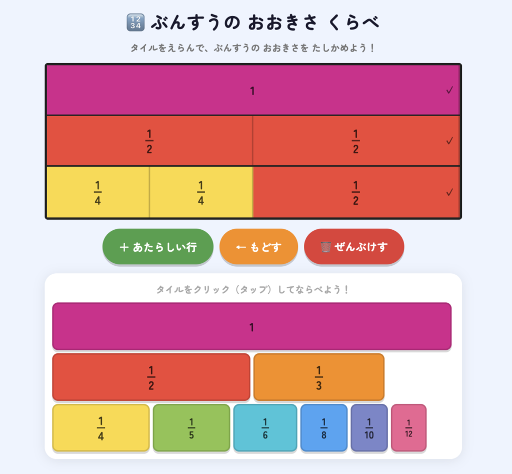 このアプリでは、分数をタップするとストリップ(帯)が表示され、並べて大きさを視覚的に比べることができます。「見て・触って・比べる」を繰り返すことで、分数の大小関係を直感的に理解する練習ができます。