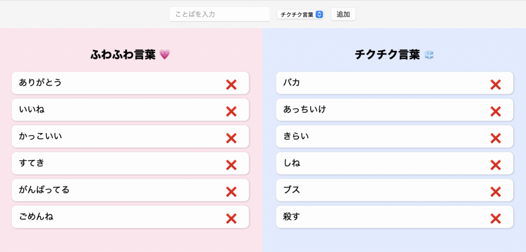 ※チクチク言葉をあまり子どもの目に触れさせたくないので、保存機能や印刷機能は付けていません。ご要望があればコメントまでお願いします。