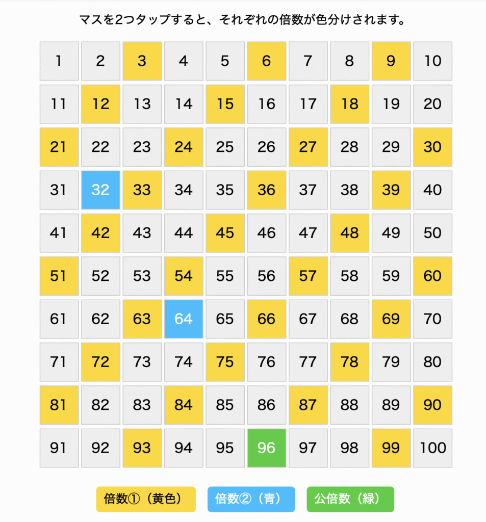 公倍数をみつけよう|倍数・約数 算数 2025.08.072026.03.29 使ってみる👉「公倍数、みつけます。」 公倍数をみつけるアプリです。使い方①「3」をタップすると、3の倍数が黄色になります。②「32」をタップすると、32の倍数が青色になります。公倍数の「96」が緑色で表示されます。使ってみる👉「公倍数、みつけます。」 【算数】公約数を見つけよう!使ってみる👉公約数を見つけよう!公約数を見つけるアプリを作りました。本来は自分で公約数を探せることが理想ですが、約数が分からずに授業を拒否したり、自己肯定感が下がってしまうことがあります。このアプリは、公約数の意味が分かるようになるまでの「... 約数をみつけよう!数字を入力して、ドットをおさらに分けるだけで「約数」を見て理解できる無料Webアプリ。ぴったり分けられたら約数、あまりが出たら約数ではないことが直感的にわかります。わり算の仕組みの確認や宿題サポートにもおすすめ。