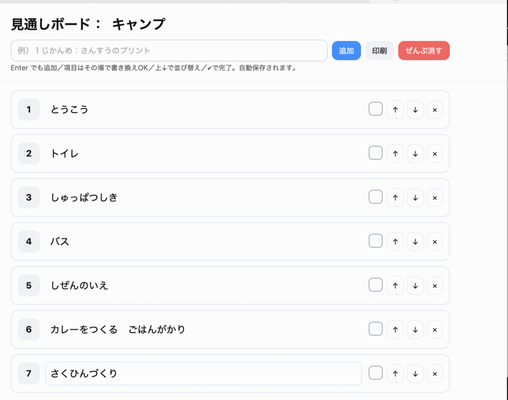 見通しボード やることを知って安心して行動しよう! 自立活動 2025.08.252026.02.21 👉見通しボード 見通しを持つと安心しますよね。このアプリでは、毎日の時間割や、遠足のしおりなどを簡単に示すことができます。 使い方 1 やることを入力して「追加」するだけ2 印刷もできます。 👉見通しボード