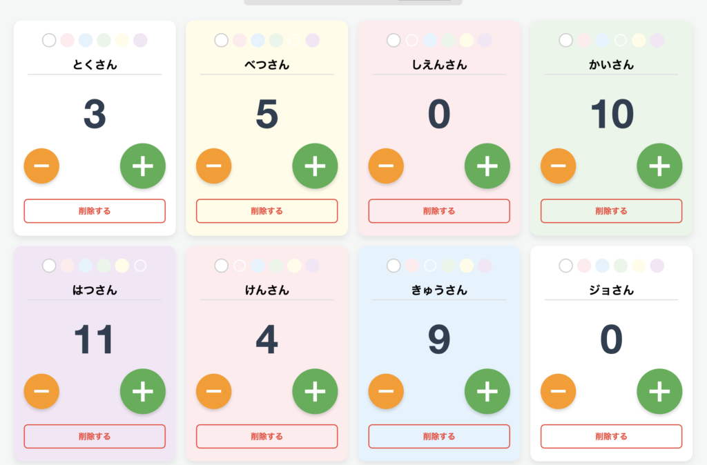 「+ 新しいカウンターを追加」でカードを増やせます。各カードの「名前」を入力し、「+」「-」ボタンでカウントします(数字は0未満にはなりません)。