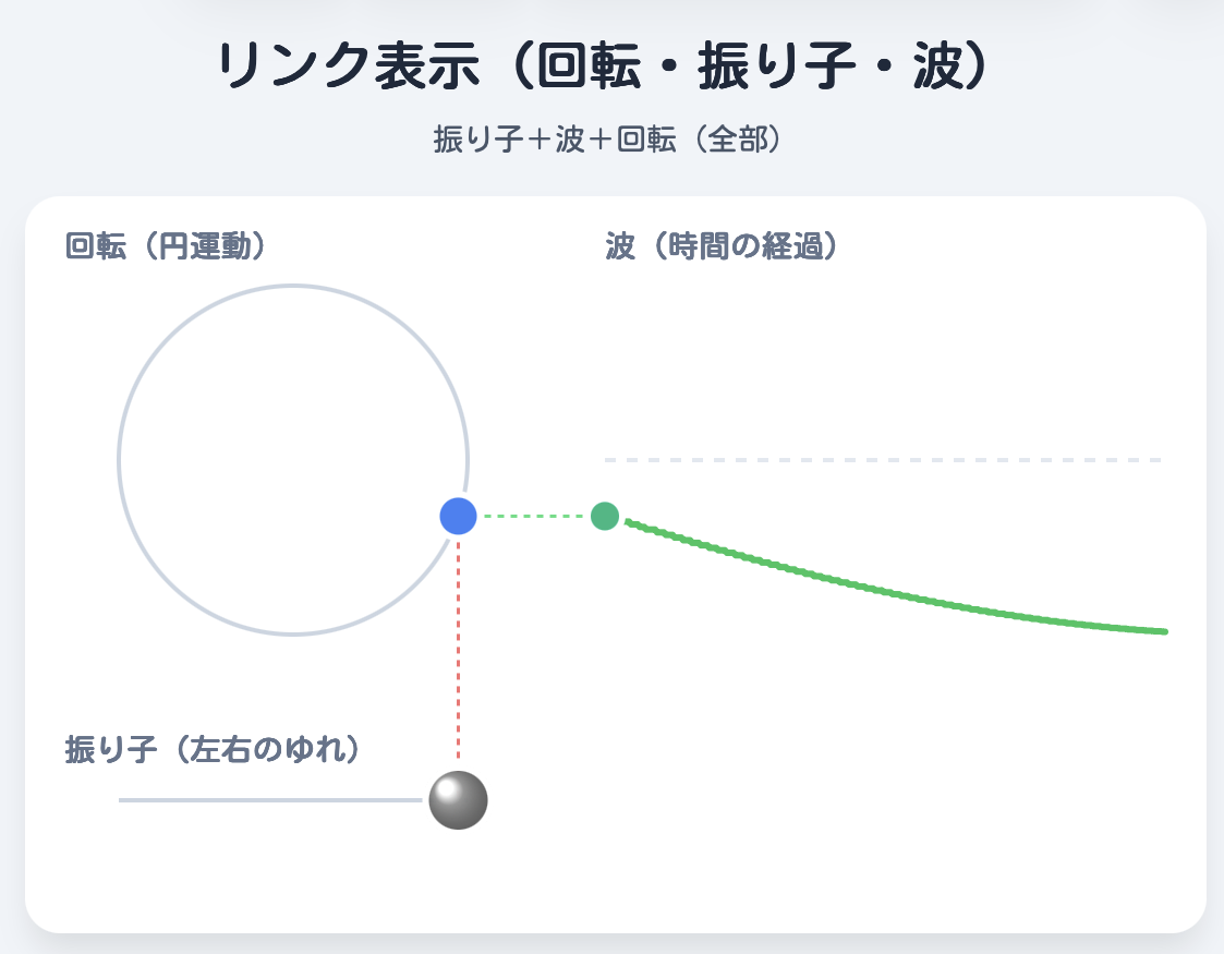 振り子 振り子・回転・波のリンクイメージ 理科 2026.02.02 使ってみる👉振り子アプリ 振り子を見ていると落ち着く子のために作りました。 ところが、作っている間に、回転や波とリンクさせたくなってしまい、変なアプリになってしまいました。 せっかく作ったので公開しますが、役に立つかな? 使ってみる👉振り子アプリ