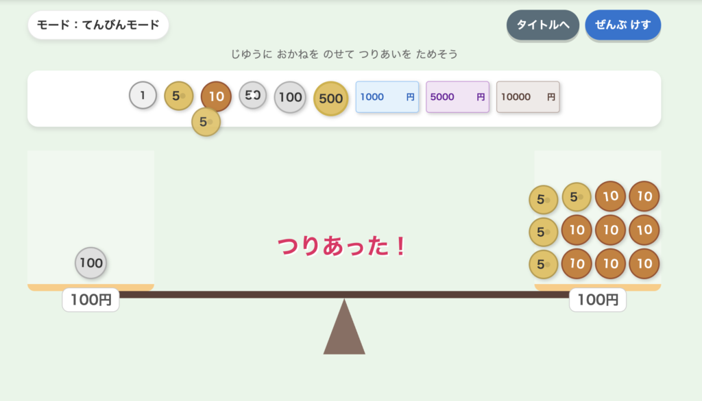 このアプリでは、てんびんがつりあうかどうかを見ながら、遊び感覚で両替の感覚を身につけられるようにしました。