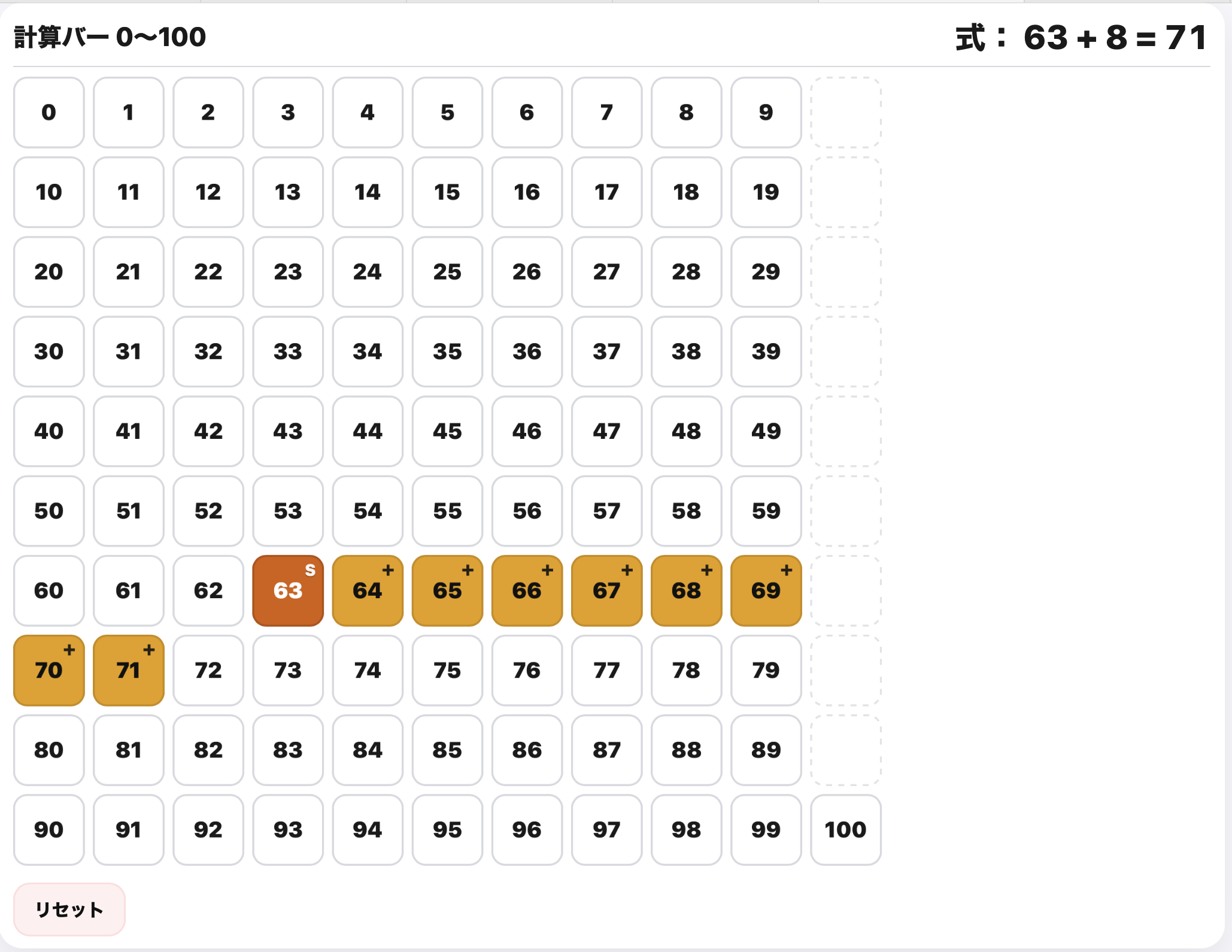 【算数】計算バー0〜100 小学1年生100までの足し算(2桁+1桁)を助けるアプリ 算数 2025.09.09 使ってみる👉数字バー0〜100 小学1年生「100までの足し算・引き算」を学習するときに役立つアプリを作りました。 使い方は、すごろくのように簡単です。 例)45+9 の場合 45をタップすると茶色になります。 9をタップしながら進むと黄色になります。 答えが54だとわかります。 引き算も同じ方法で、水色で示されます。 式が自動で表示されるので、作業を通して足し算・引き算の意味を理解する助けになります。 使ってみる👉数字バー0〜100 0〜20までのものは↓の記事から。 計算バー これがあれば足し算引き算ができるのだただの20までの数字が並んでいるだけ。でも、これですごろくのように計算をして足し算引き算ができるようになる子がいます。わたしの経験の中でこれがあれば「できる!」という笑顔を最もたくさん見ることのできた道具です。「5+3」は、5に指や鉛筆を置...