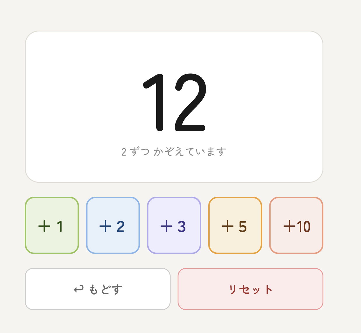 2とびや5とびで数える力は、かけ算の学習や数の規則性を理解するための大切な基礎です。このWebカウンターでは、ボタンを押すたびに2や5ずつ数が増えていくので、リズムよく繰り返し練習することができます。