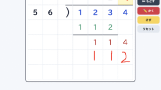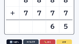 引き算の筆算手順をステップごとに学べる無料Webアプリ。マスをタップして問題を入力し、「つぎへ」で計算の流れを一つずつ確認できます。手書き入力対応で、特別支援や家庭学習の筆算指導に最適。