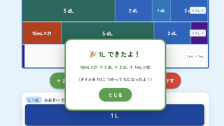 タイルを並べて1Lをつくる操作活動で、dL・mLの関係を体感的に学べるWebアプリです。「10dLで1L」「1000mLで1L」を自分で発見できます。小学校算数・特別支援学級のかさの学習に。
