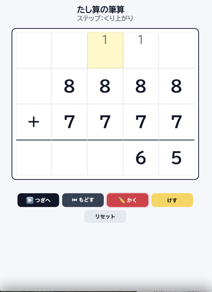 たし算の筆算の手順をステップごとに確認しながら学習できるアプリです。