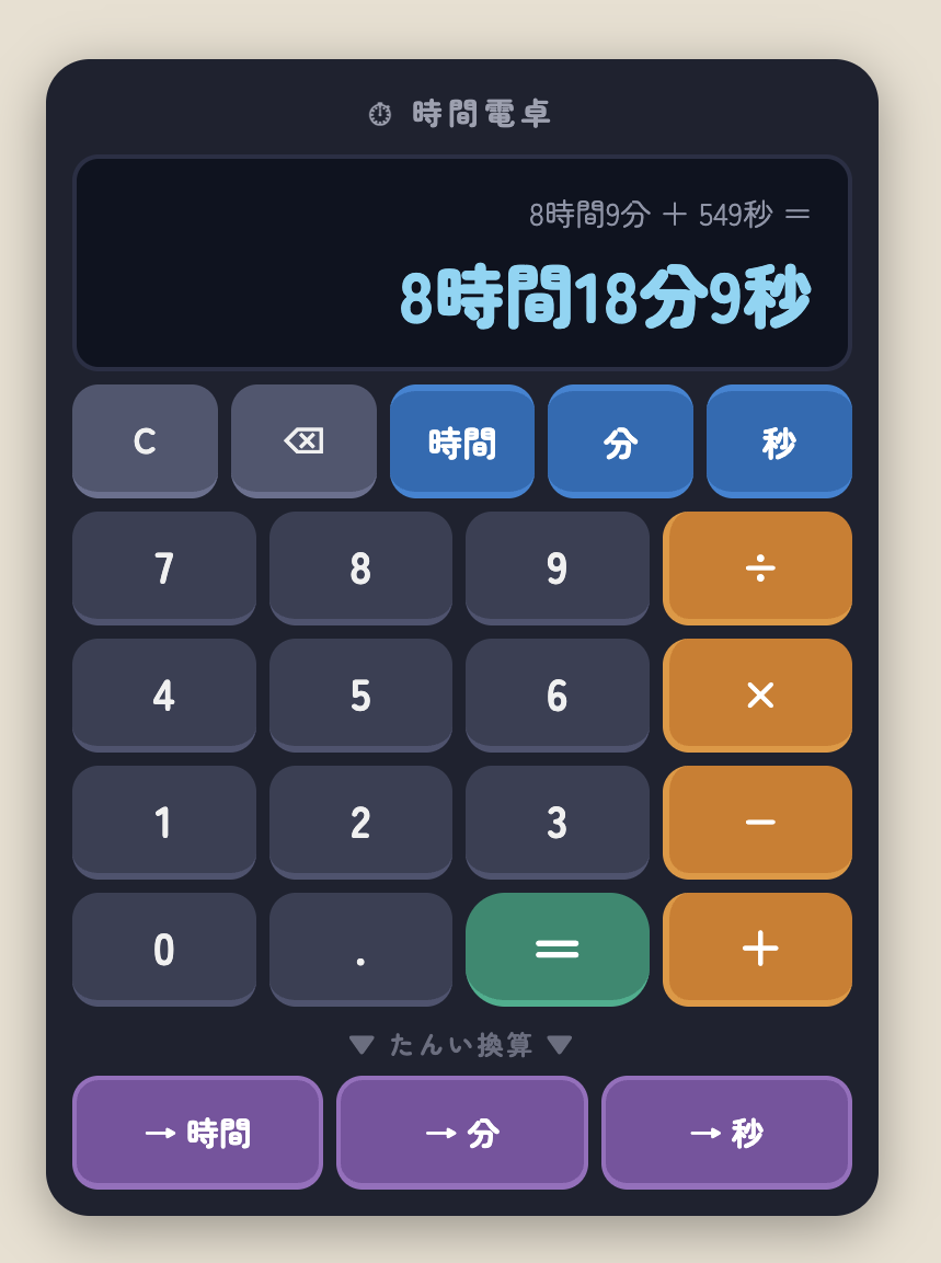 時間・分・秒をつかった計算ができる電卓アプリです。たし算・ひき算・かけ算・わり算に対応しています。たんい換算もワンタップでできます。