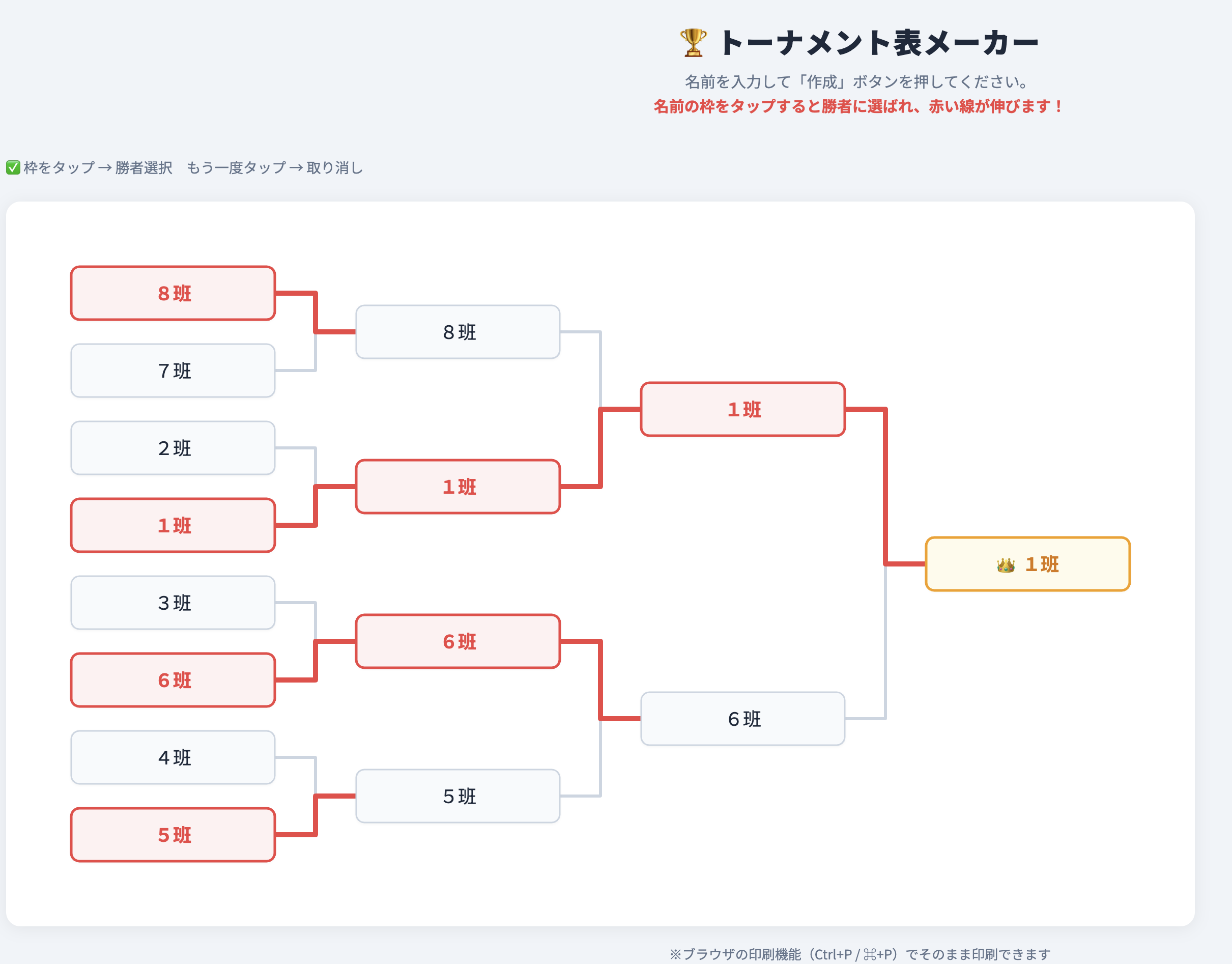 画面右上の「🖨 印刷」ボタン、またはブラウザの印刷機能(Ctrl+P / ⌘+P)で印刷できます。トーナメント表だけが1ページに収まるように調整されています。