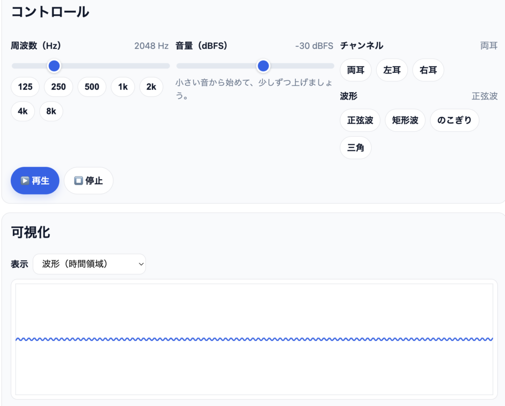 - 周波数(125〜8000Hz)と音量(-60〜-6dBFS)の調整