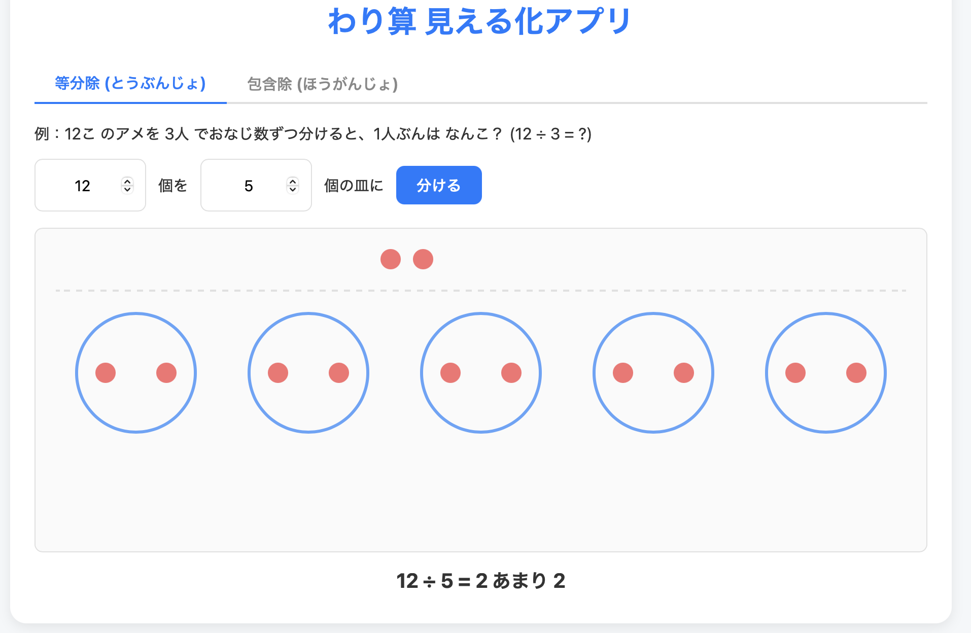 「等分除」や「包含除」を、簡単なアニメーションで表現。